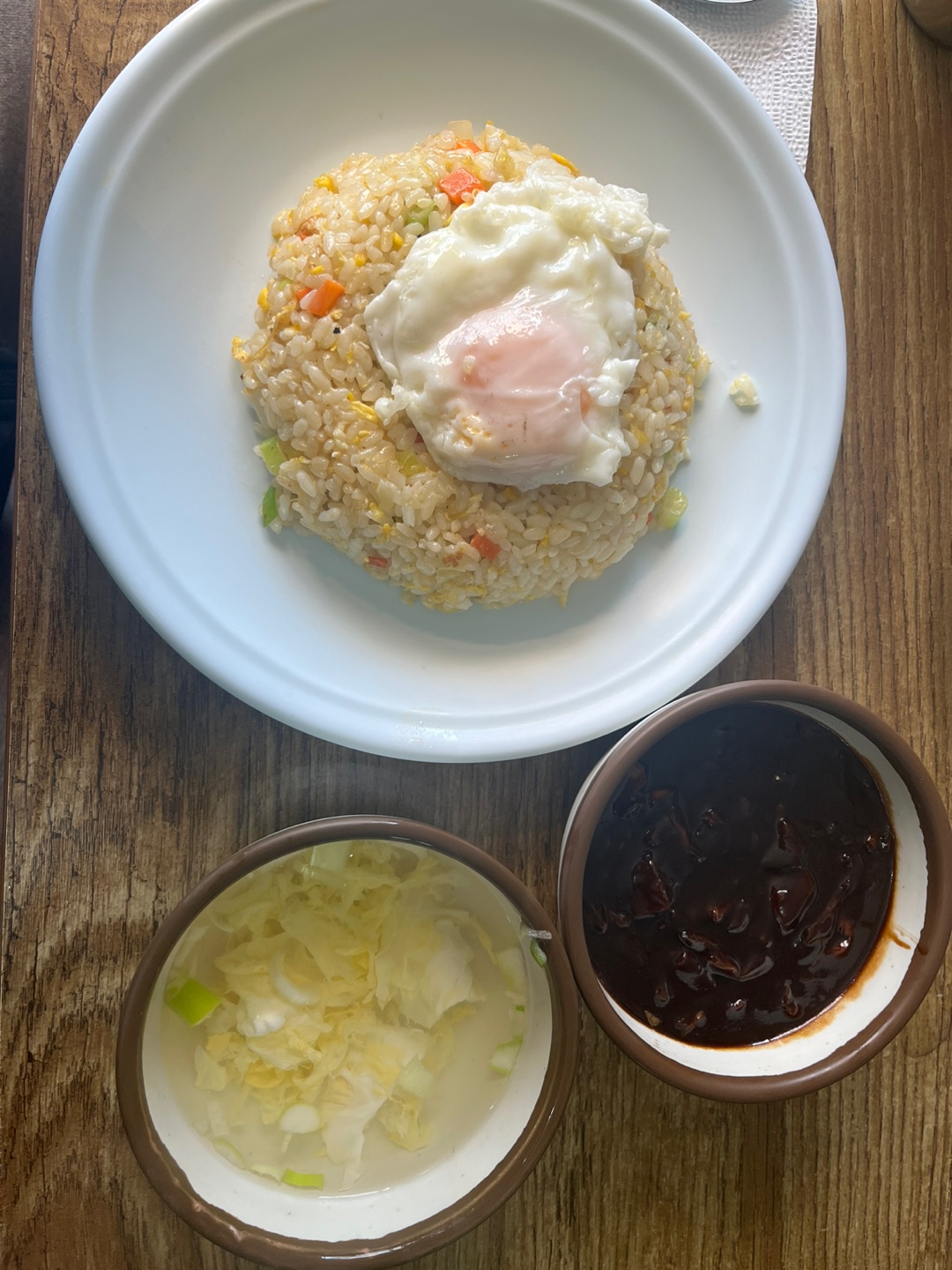 볶음밥은 다른 중국집과 크게 특별하지는 않고, 고슬고슬한 볶음밥 위에 반숙 계란후라이와 계란국이 나왔고 짜장소스는 살짝 새콤한 맛이 느껴졌어요! 모두가 생각하는 중국집 볶음밥맛입니다.